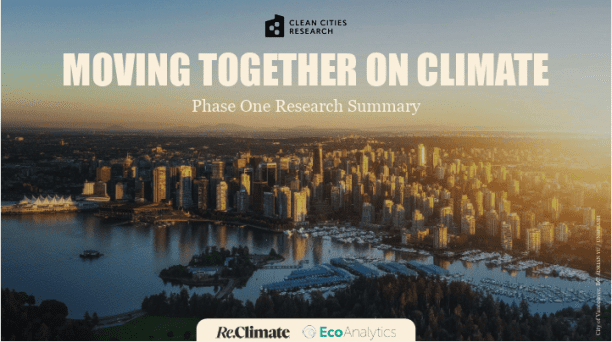 This summary report outlines the key findings in Re.Climate’s interviews with city-end user stakeholders on priority climate policy areas and the climate communications landscape. City staff and elected official interviewees from BC and ON provided rich and nuanced perspectives from which several opportunities for working with eNGO’s on strategic issues that have the potential to mobilize the public, build on existing momentum and align with provincial regulations. These results will help to inform the Phase 3 Quantitative Surveys of the Clean Cities Research.