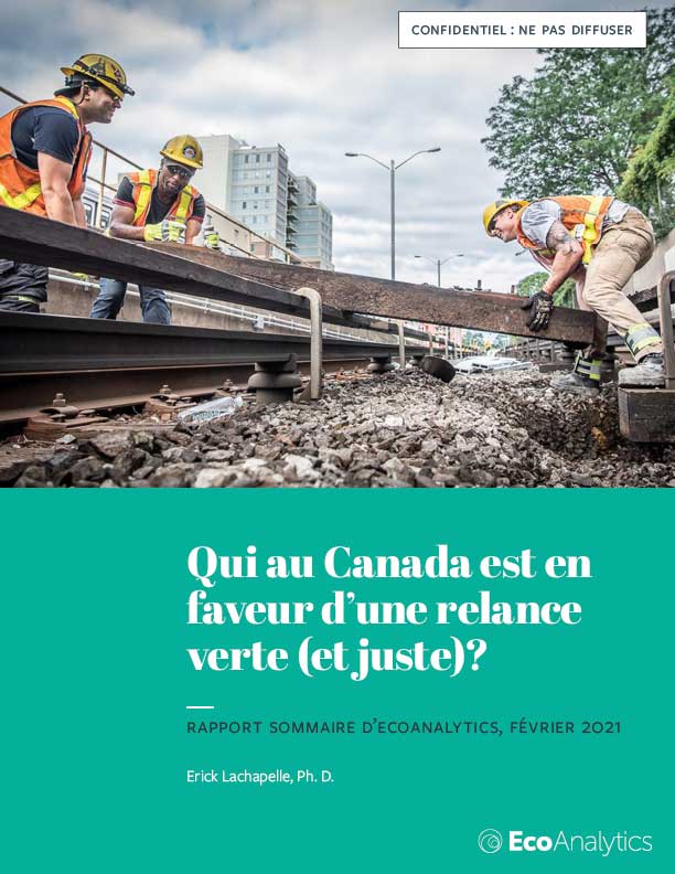 This detailed report summarizes the results of EcoAnalytics’ first Climate of Change survey: tracking the opinions, perceptions and concerns of Canadians about climate change and energy issues to provide a baseline for future EcoA surveys. The opening section also presents a ladder of engagement on climate change for different groups of Canadians, with socio-demographic observations. Another section looks at opinions regarding national and provincial government responsibility for addressing climate change, and levels of support for different policy measures, including carbon taxes costing different amounts.